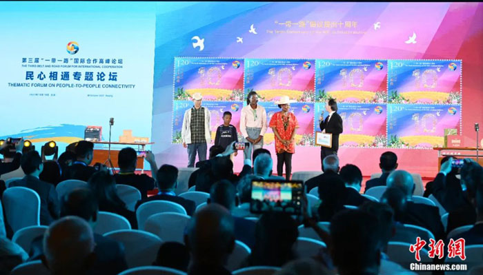 该邮票也出现在了第三届“一带一路”国际合作高峰论坛民心相通专题论坛。在论坛“丝路金桥成就美好生活”环节,拥有1000多万中国社交媒体“粉丝”的非洲姑娘罗斯(Rose),讲述了通过“丝路金桥”收获美好生活的动人故事,以及她把中国文化带到非洲、把非洲文化带到中国的民心相通故事。我登台把绘有“丝路金桥”的《“一带一路”倡议提出十周年》纪念邮票送给了她。
