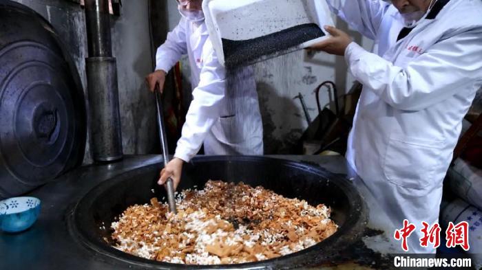 在黄山市徽州区的岩寺老街,制作红薯冻米糖的糕点坊内,制糖师傅早早地就开始忙碌起来,远远地就闻到一阵阵熟悉的香甜味道。据了解,冻米糖作为徽州地区的传统糕点,是春节期间家家户户招待宾朋的必备食品。