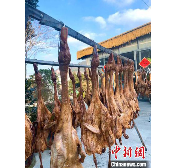 “我们制作的上百只酱鸭早已被预订一空,订单不仅来自浙江省内,还有很多省外的客人也想尝一口‘家乡味’。”蒋秀飞表示,尽管做的酱鸭每年都“不够卖”,但整齐晾晒的酱鸭也成了鞍山村里独具年味的一道风景线。