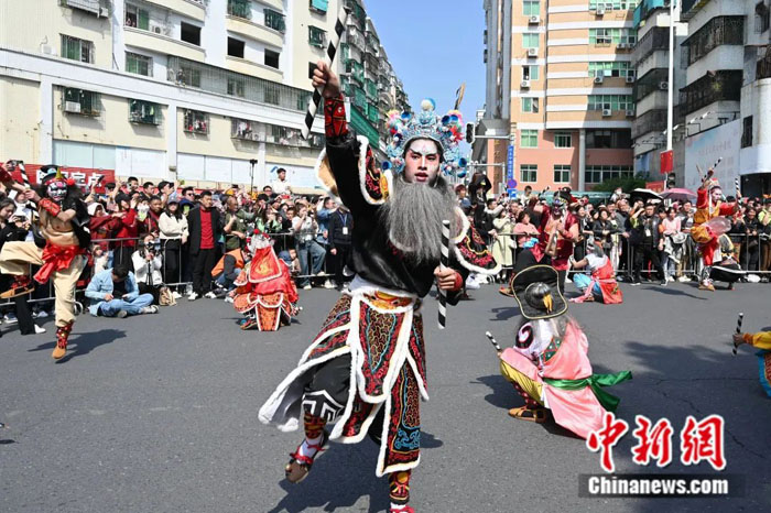 当急促的锣鼓声响起,一群“梁山好汉”闪亮登场,他们挥动英歌槌,快速翻转叩击,步伐铿锵有力,呐喊声响彻四方,所到之处一片欢腾。