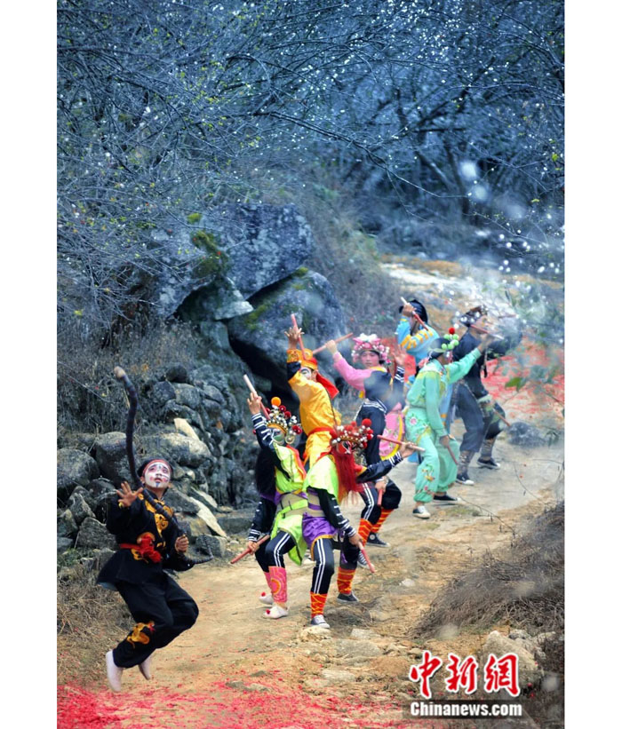 此外,男子英歌勾画脸谱较为夸张,女子英歌表演时以淡妆为主,额头上画有“火”的标志,有团结、巾帼不让须眉之意。