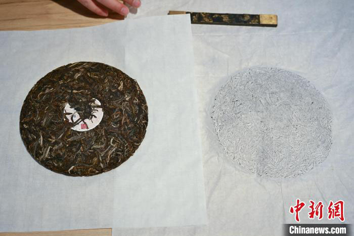 只见他将打湿的宣纸附着在普洱茶饼上,使用棕刷刷走气泡、使之紧贴,再用拓包沾墨轻轻拍打,一根根条索分明的普洱茶就跃然纸上。伴随着一轮又一轮的上墨,茶饼开始逐渐生动、层次分明。