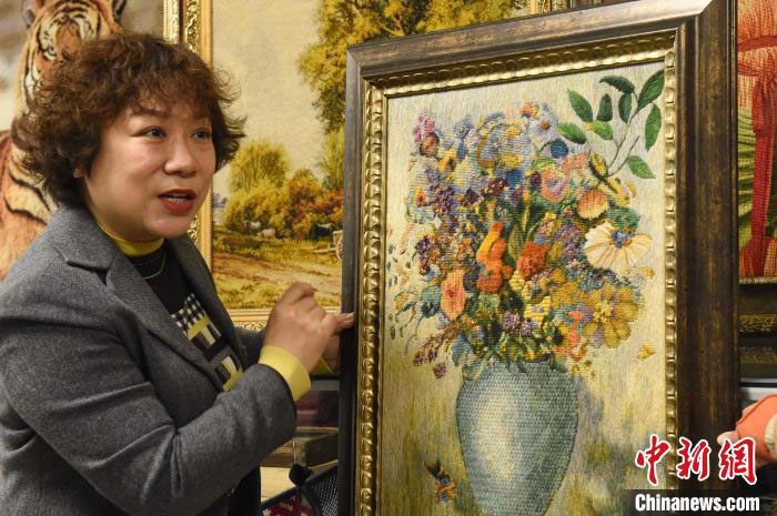 在烟台绒绣传习基地工艺美术展馆内,精致的画框里镶嵌着以静物、人物、风景为题材的绒绣作品。名为《瓶中花》的绒绣作品,远看宛如一幅油画,近看则是毛线交织的光影艺术,每朵小花都有独特的姿色。