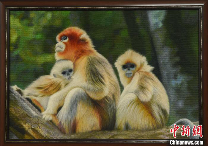 《吉祥三宝》是该展馆的“镇馆之宝”,由80多岁的山东省工艺美术大师、省级非遗代表性传承人唐淑娟创作完成。作品中的金丝猴使用了她独创的拉绒、栽毛等针法绣制,细致入微,毛发丝丝可见。