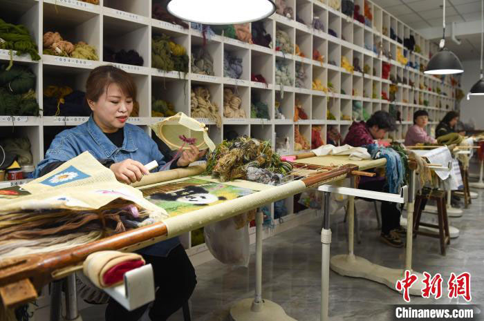 配色、劈线、捻线、纫针,在烟台绒绣技师王兴珠的手指翻飞间,针尖上的羊毛绒线好似色彩丰富的颜料,在绣布上点涂晕染。经过数万针的穿引,一只毛茸茸的大熊猫栩栩如生地呈现出来。