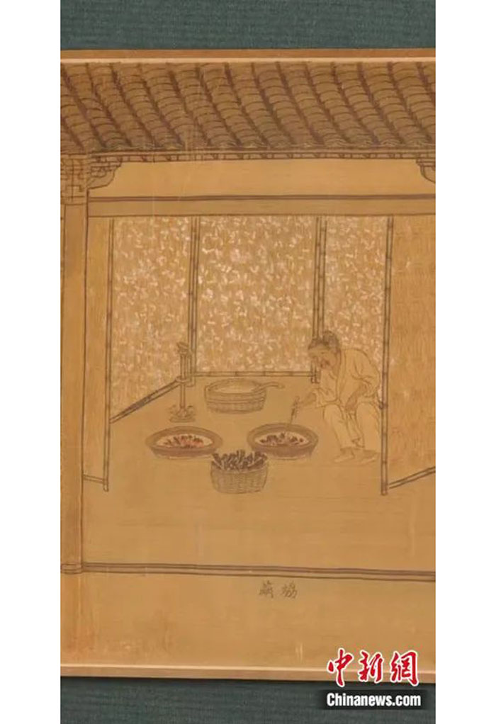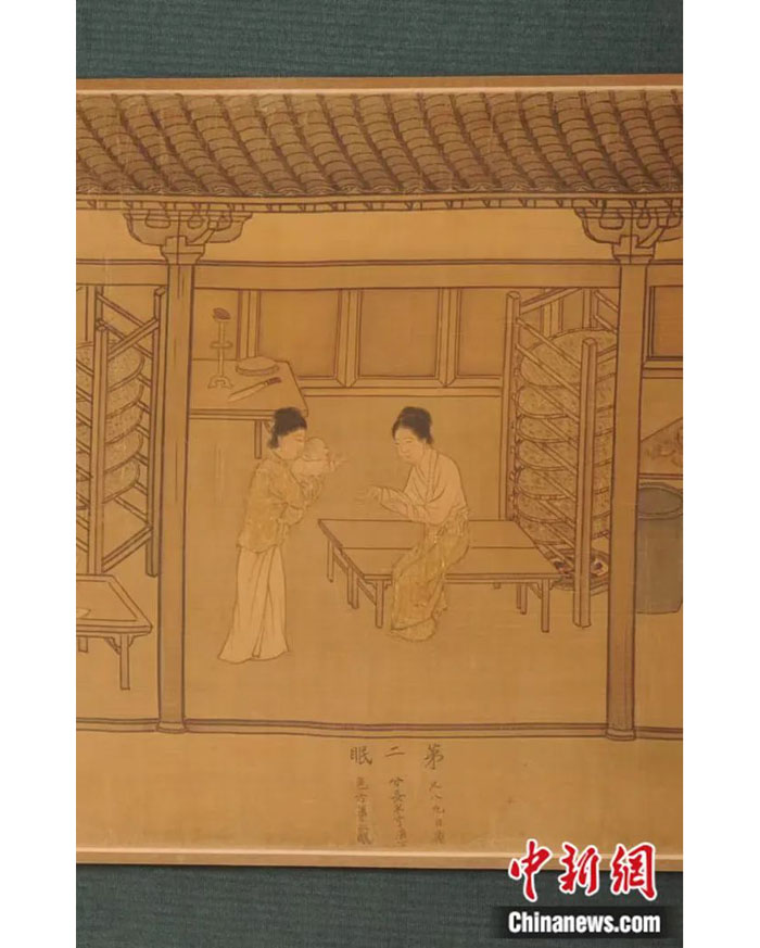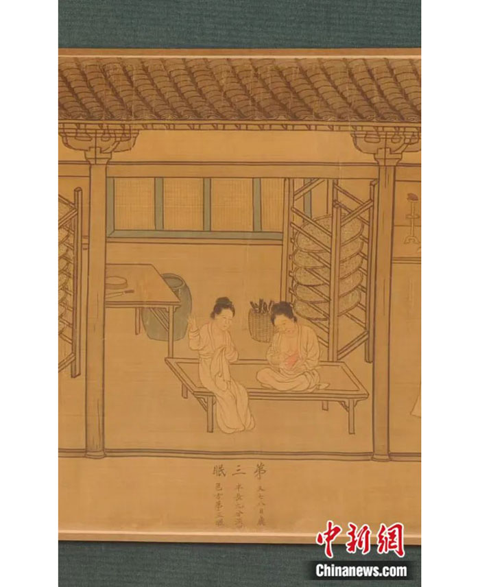 1983年被黑龙江省博物馆收藏的南宋《蚕织图》卷轴,以一长廊式连房贯穿画卷始终,24组场景绘出蚕织24事,并有楷书小字说明内容。