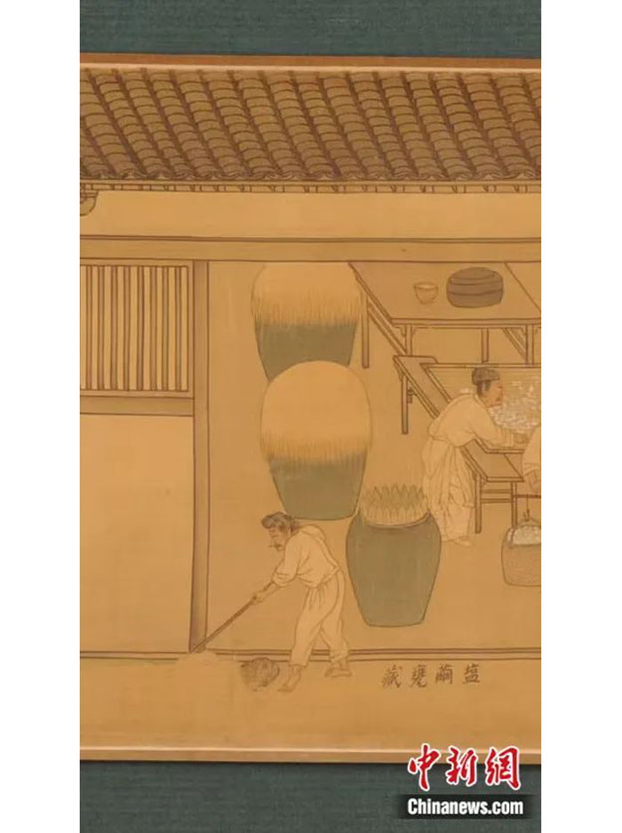 “盐茧瓮藏”画面上有三口大瓮,两瓮已用泥封好,一瓮尚敞口待装茧放盐。操茧工,一在桌前收茧;一在秤茧;一在和泥。此蓄茧技术,在《齐民要术》和《农政全书》中都有记载。