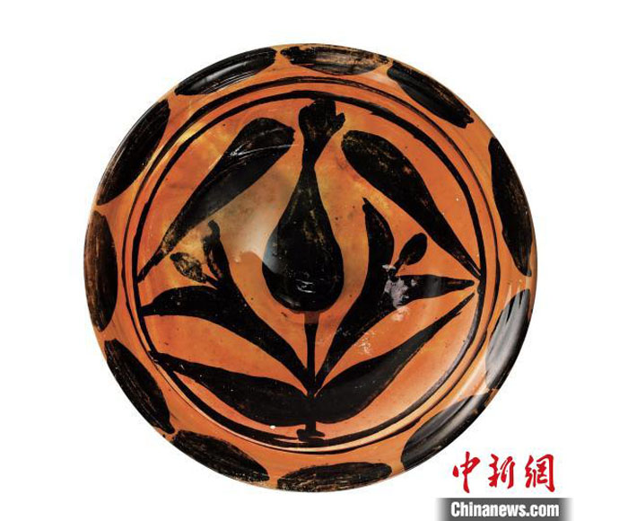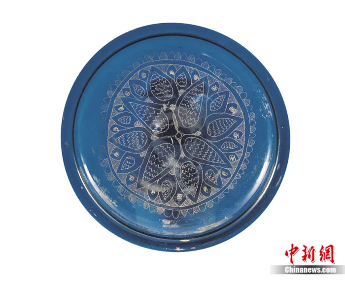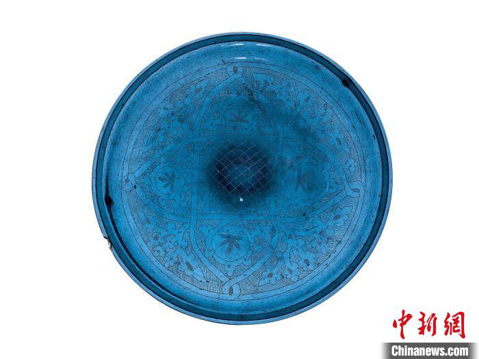 其中,四瓣花纹蓝琉璃盘口径20厘米,高2.3厘米,吹制成型。盘外底心凸起,有铁棒加工痕迹。盘心正中为正方形方框。方框内为虚实相间的小斜方框,方框外刻四个拱门形状的尖瓣,与中心方框组成四个“米哈拉布”纹样,四个尖瓣内,各刻一朵五瓣枫叶纹,尖瓣之间也饰以植物纹。