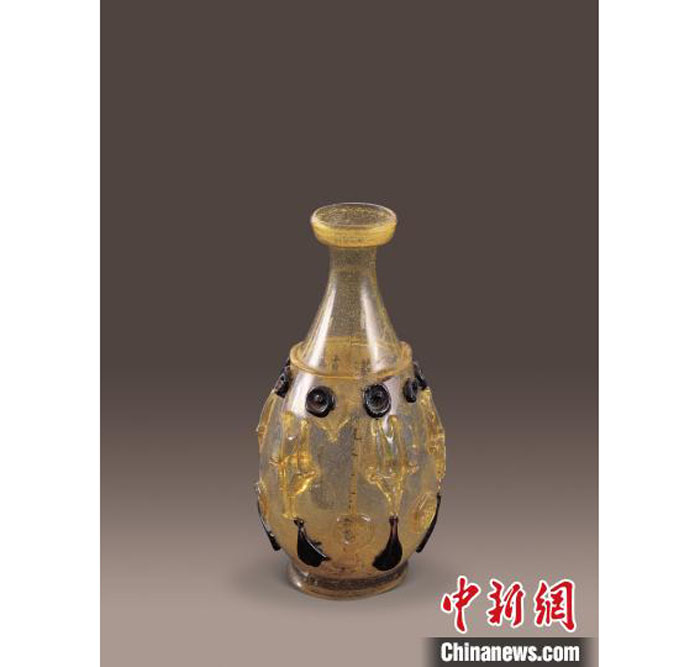 在法门寺地宫中出土了一件淡黄色盘口细颈琉璃瓶,高21厘米,腹径16厘米,采用无模吹制成型。瓶身肩部粘贴一道相同颜色的玻璃丝。腹部贴有四排装饰,第一排为8个深蓝色的圆饼形装饰,第二排为6个不规则五角星装饰,第三排为6个莲蕾状的圆饼形装饰,靠近底部的第四排为6个深蓝色水滴形装饰,这些属于玻璃的热加工工艺。其内墨书有残留的“真”“莲”二字,应是寺院原存物,盛放舍利所用。
