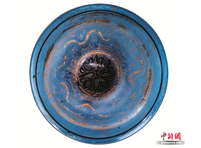 此外,还出土了一套淡黄色琉璃茶碗茶托,模吹成型。琉璃茶碗高4.9厘米,口径12.5厘米,淡黄绿色,喇叭形口,小平底。琉璃茶托高3.6厘米,盘径13.7厘米,平底深托,下有矮圈足。从器物造型可以看出,这是典型的中国传统茶器造型。但通过科学检测,琉璃茶碗和茶托为典型钠钙玻璃,与法门寺地宫出土的其他伊斯兰琉璃器成分非常一致,也属于植物灰型钠钙玻璃,与中国产的高铅玻璃和钠钙玻璃有很大的区别。