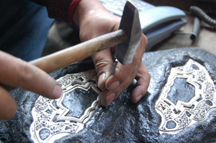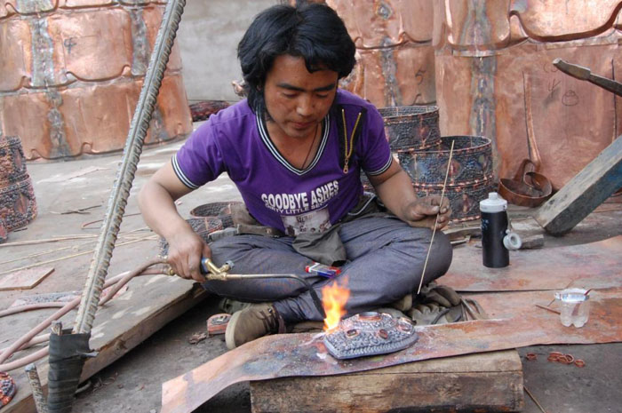 藏族金属锻造技艺在技法上除了一般的铸、雕、提、包、镀、嵌等外,还常采用敲击法。其中两个关键步骤是“錾刻”和“敲打”。先用铅笔在铜板上勾勒图案,再按照铅笔线条錾刻出来。“敲打”要求工匠在器具成型的过程中,一直保持适当力度不停敲打,一天要敲打一万多次,甚至更多。百炼成钢,千锤成器,器具、造像上每一处敲打的痕迹,都是工匠们岁月的积淀和初心的坚守。