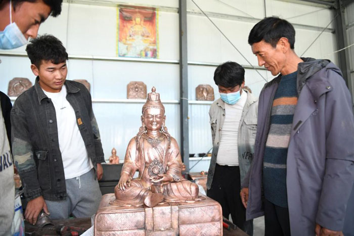 嘎玛乡坐落在西藏昌都市卡若区东北部扎曲河上游河畔,被称为“匠人之乡”,也是藏族金属锻造技艺的代表性传承地,其佛像锻造技艺的历史可以追溯至七世噶玛巴却扎嘉措(1454--1506)时期。自治区级代表性传承人顿珠罗布在政府的支持下成立了嘎玛金属锻造技艺传习所和就业培训基地,目前已经有多批学徒从传习所结业,有的已经自立门户,成为独当一面的手艺人。