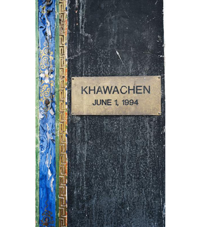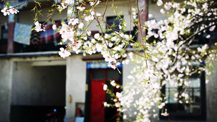 喀瓦坚藏毯厂成立于1994年6月1日,迄今已有三十年。一块刻有岁月痕迹的木质门牌,仿佛默默诉说着这个院落的历史。走进大院,两层民居的四合院环绕着天井,院内空地上晾晒着刚编织好的几块藏毯,远处有一株桃树,满树繁花让整座院落散发着春天的气息。这就是喀瓦坚藏毯厂,也是藏毯厂所有员工居住的地方。