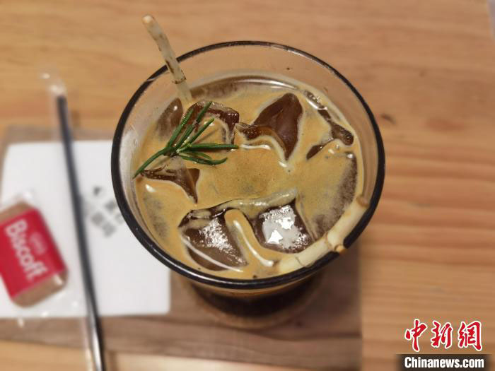 在贵阳市区的黑石咖啡馆,折耳根美式就吸引不少年轻人购买尝鲜。玻璃杯中倒入冰块,加入散发草本清香的折耳根水和一根新鲜的折耳根,随后缓缓倒入浓缩咖啡液,最后加入些许迷迭香做点缀。