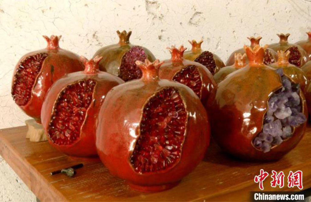 在自己的众多石榴作品中,最令刘兵满意的作品还要数“开口笑”石榴摆件。据刘兵介绍,“开口笑”石榴摆件将上釉彩陶和水晶、琉璃等材质相结合,不仅完美复制出了成熟石榴的油亮饱满,还展现出石榴籽紧紧依偎在一起的晶莹剔透,形成了独具特色的造型景观。