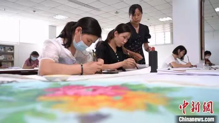 长12米、宽0.8米的工笔牡丹画,桂怀芳一个月能画两幅,每幅能给她带来4000元的酬劳。“在这工作很自由,到点就去接孩子,不耽误照顾家里,也能增加家庭收入。”