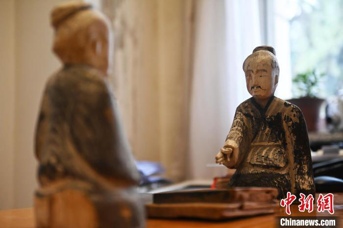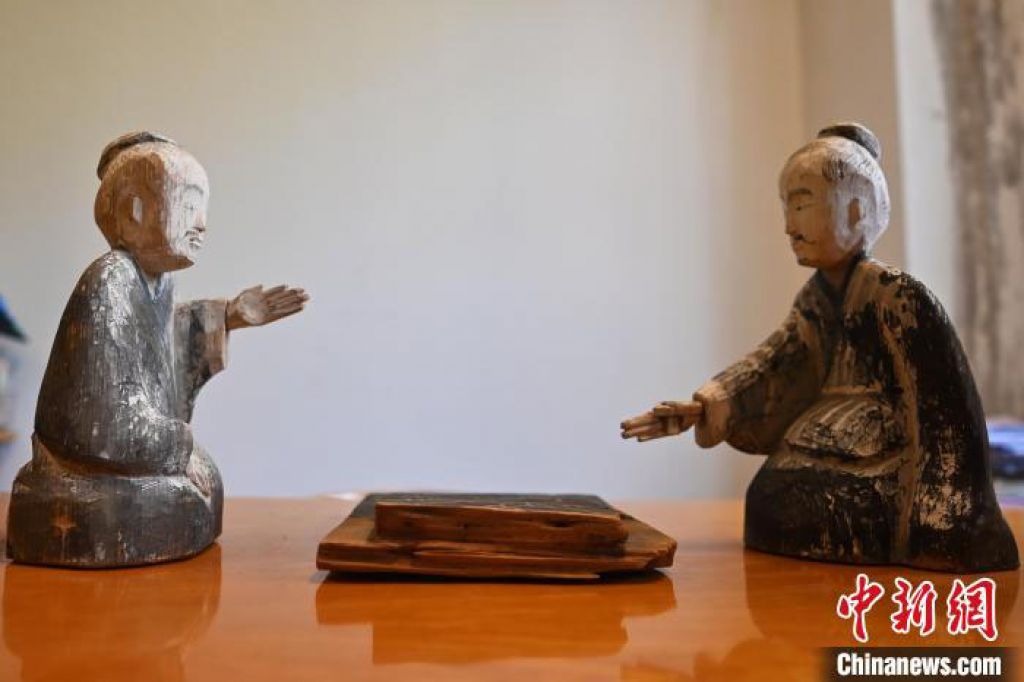 细观甘肃省博物馆馆藏的这座彩绘六博俑,也可感汉代木雕技艺“汉八刀”之简洁大气。所谓“汉八刀”,既形容其刀工简练粗放,宛若八刀而就,也因用刀讲求左右对称,奏刀后左右两道线槽形成了“八”字效果。六博俑两位老者头发疏薄和身体不同部位起伏圆折之处,均是这种雕刻技艺的体现。“一招一式,一呼一应,一开一合,把两位棋者的内心所想,通过手势、眼神以及身体的动态完全雕刻出来。”米毅说。