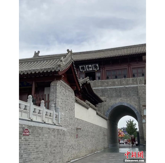 阳和楼建在高敞的砖台上,两侧各有碑亭一座。砖台跨街而建,如城门形式,台下有圆形拱门,左右各一,将行人车辆分为上下道。