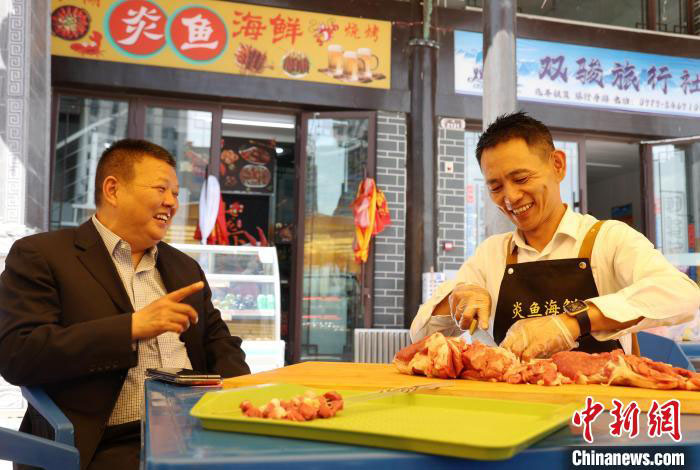 青海小伙颜积德在昆仑天街经营江湖炎鱼海鲜,海鲜大咖和炎鱼爱吃的饭是他的两道招牌菜,“我们还烤牛羊肉串,但我们只选择本地现杀的牛羊肉,不然别人一吃就能发现肉新不新鲜,不能砸自家招牌。”