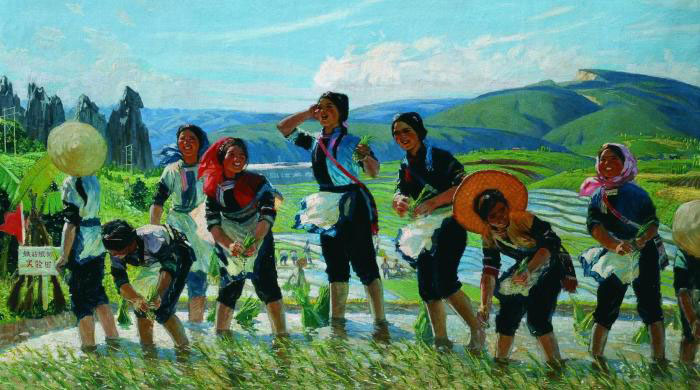 “当时的我就像一头饿狼见到了猎物,饥不可待,兴奋异常!扑上去,不假思索,任凭直觉,拿起画笔,就直接上布。”孙景波回忆,那些“阿细(彝族支系)姑娘”坦然而快乐地伴随他急不可待的心情,争先恐后地站到画布里的秧田当中。整幅画作阳光明丽、风轻云淡,人物在阳光水影中劳作,视觉上给人一种如诗如歌的意境。