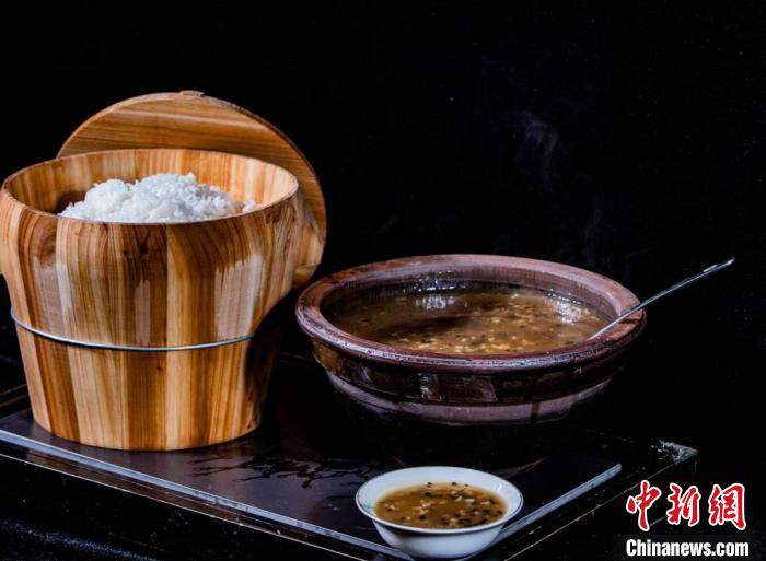 在光泽,“捞饭”是招待贵客的一道风味汤羹。大米在沸水中翻腾,经过多次搅拌,形成米汤,米汤加入咸菜,这就是“同粥共济”(黄精腌菜干米汤)。