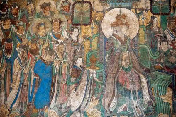 而永乐宫最为闻名的,当数四座元代建筑内的壁画。尤其三清殿中描绘群仙朝谒元始天尊的《朝元图》,遍布其上的290位神仙面目姿态各异,无一雷同之感,堪称群像绘画的一个巅峰。其画风继承了唐、宋以来盛行的“吴带当风”,以线为骨,笔触飘逸,再用重彩勾填,颜色丰富而饱满。