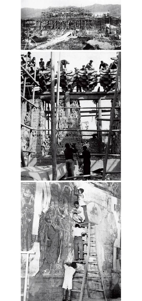 一切都在摸索中展开。最初几年,美术专家先进行了对壁画的原尺寸着色临摹,建筑学家则通过周密测量,绘制出详尽的结构、平面图,并对每一部分构件准确标注名称和编号;与此同时,对于新址的选择,也从各个层面给予了充分的勘察、比较和论证。1959年6月,经过多次实验,壁画揭取正式开始,先对脱落、酥松及裂缝部分进行加固,清洗壁画表面并刷以特制胶矾水保护,然后拆除宫殿屋顶,用自制的手摇锯将附有壁画的墙壁逐块锯下,再以同样的方法,把壁画泥层分离出来。就这样,总面积960平方米的壁画被分成了341块,按照揭取的次序编号装入垫有棉花和拷贝纸的木箱,四周装订木板,背面压牢木框。1960年9月,三门峡大坝开始蓄水之前,所有建筑及壁画都已得到转移。又过了6年时间,在芮城县以北3公里的平地上,永乐宫以它原模原样的风貌重新亮相于世人面前。