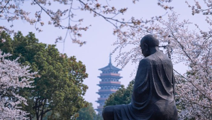 鉴真路也是扬州的一条网红路。每年春天,来这里打卡的人流量达到一年中的高峰。此时,路两旁的樱花盛放,白樱胜雪,粉樱如霞。绚烂的樱花仿佛向人们讲述着鉴真东渡日本的事迹。