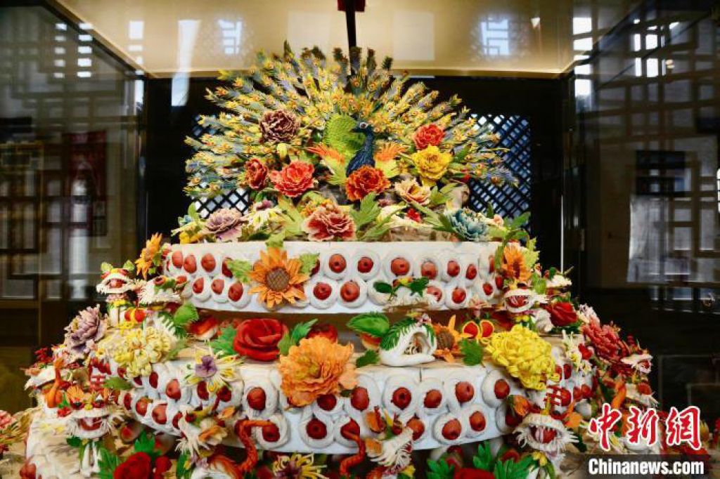 吉祥喜庆的寿桃、活灵活现的飞龙、绚丽缤纷的玫瑰……走进太原古县城一家花馍店铺内,透明的玻璃柜内陈列着各式各样的花馍,造型多样、内涵丰富、色彩艳丽。