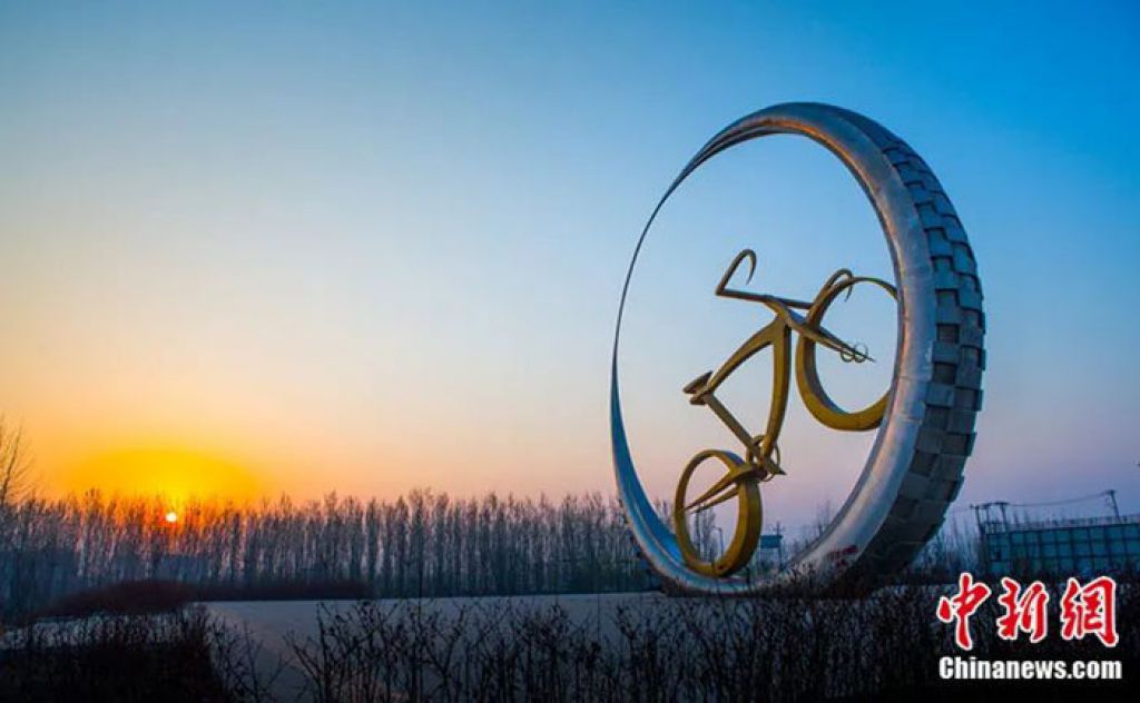 走进河北省邢台市平乡县,你会看到一个由巨大的银色车轮和金色自行车组成的地标雕塑──日升月恒。作为中国最大的自行车主题雕塑,它代表着“中国童车之都”平乡在骑行界近50年打拼下来的绝对“江湖地位”。