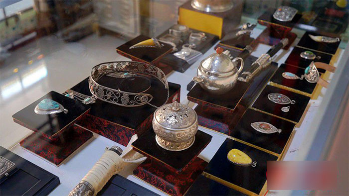 街上的“守艺”工作室里游客络绎不绝,项链、手链、耳饰等蒙古族银饰令人目不暇接。作品传承了蒙古族银饰,融合各民族文化的元素,每一件饰品都是特别精致的艺术品。据店主苏力迪介绍,这里制作的手工艺品已远销东南亚。