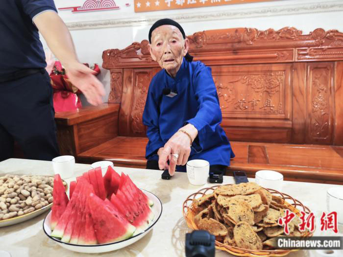 虽已106岁高龄,但老太太依旧精神矍铄,蓝色布衣,黑色抹额,不仅头发梳得利落,亮堂堂的客厅也收拾得妥帖。“妈妈身体还可以,每天正常吃饭,喜欢吃素。”儿子王地长笑得腼腆:“可以生活自理,有时候还能去赶集。”