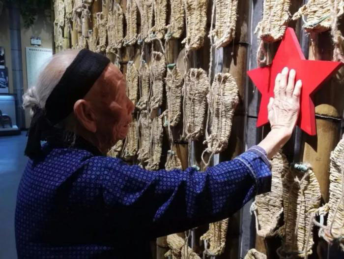 某一天,他领着段奶奶在中央红军长征出发纪念馆内转悠,画像、雕像、衣服,段奶奶一件一件看过来,停在了一面草鞋墙前──“那面墙上有一颗红色五角星,她一直摸着那颗五角星,不肯往前走。她哭了,说金长哥哥帽子上也有一颗五角星。”