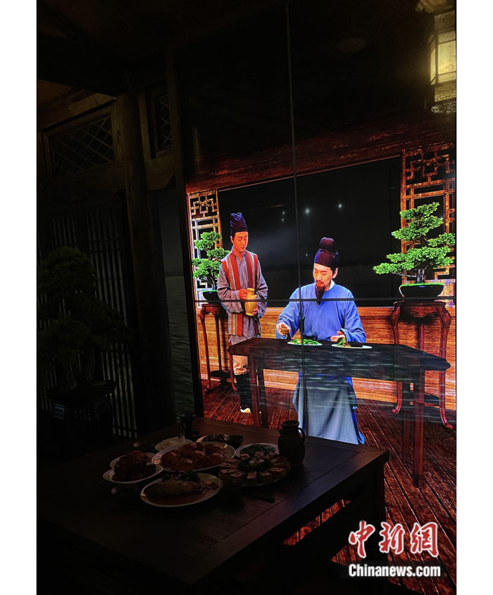 走进琵琶亭,游客可登上木质大船,伫立船头欣赏现代光影下的剧目《浔阳江头夜送客》;再前进几步,一方木桌上布满丰盛的酒菜,游客亦可通过数字技术与白居易月下对酌,畅谈人生。