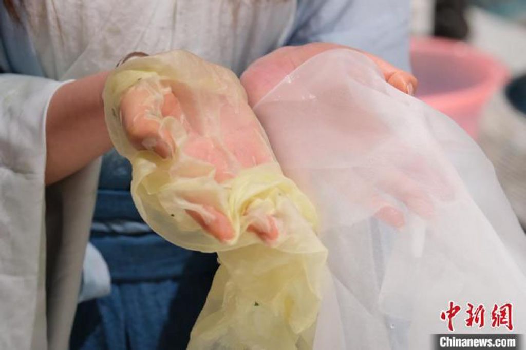 将荷叶自池塘里摘下,用手反复揉搓,让纱布与汁液充分融合,稍等片刻,一块黄色的纱巾就出现在段惠的手中。