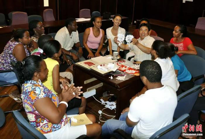 剪纸可以有很多表达形式,可以讲中国故事,也可以讲海外故事。我去过很多国家,也曾用剪纸的形式来给他们表达当地的民间传说。有一年我去毛里求斯,当地的狩猎和渔猎文化非常具有代表性,我在现场不描不画剪了一幅以渔猎为内容的剪纸作品。看着自己的生活通过剪纸表现出来,部族里的人们举着作品手舞足蹈地跳起舞来,真是令人感动。