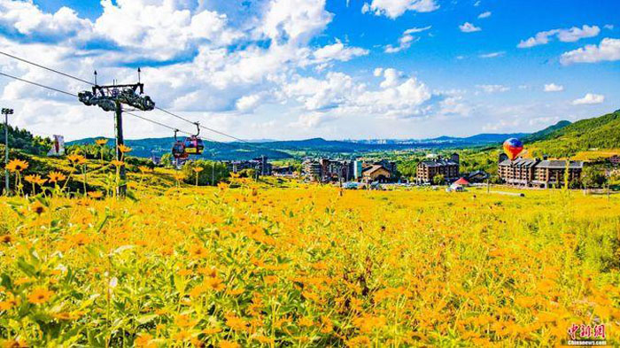 此时的雪道被鲜花覆盖,缆车穿梭其间,仿佛穿越花海。从缆车中俯瞰,五彩斑斓的花朵与郁郁葱葱的树木交织在一起,绘就一幅美丽的画卷。