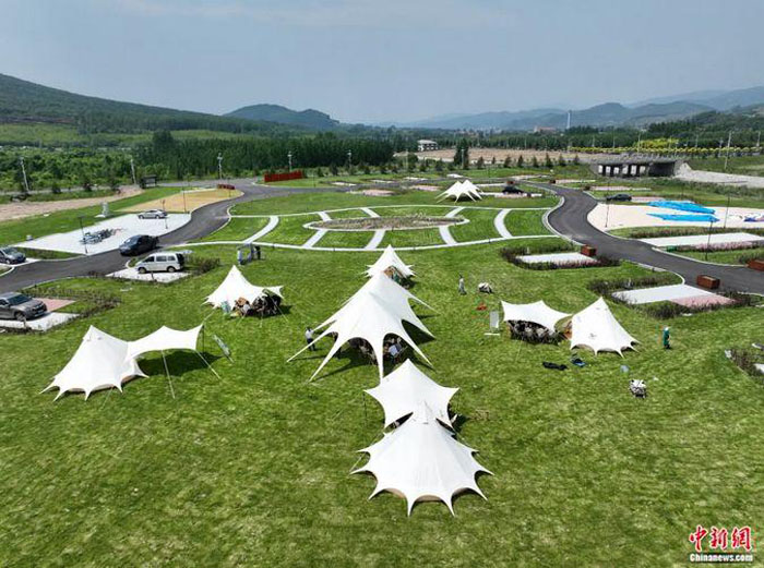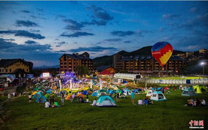曾经在雪季最热闹的雪滩区,如今变成了超大的露营场,俨然是露营星人的天堂。支起天幕,搭起帐篷,在蓝天白云下,畅享夏日清凉。