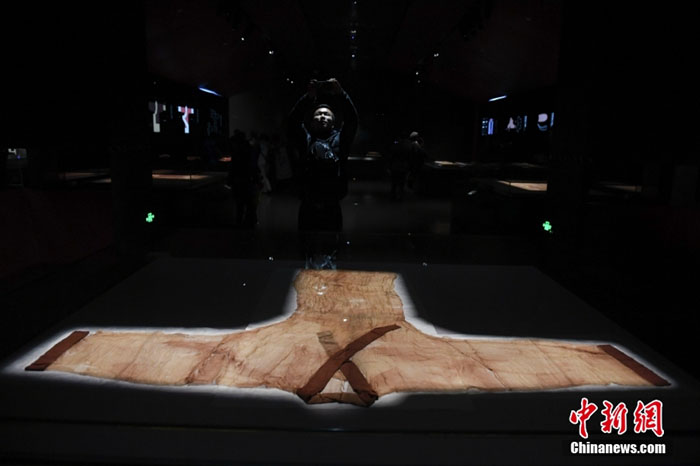 如今,人们最熟悉的素纱襌衣是在“长沙马王堆汉墓陈列”中常年展出的直裾素纱襌衣,它衣长132厘米,通袖长181.5厘米,重49克。与之相比,今年首次公开亮相的曲裾素纱襌衣要更长更宽,它的衣长160厘米,通袖长195厘米,重量上却更要轻一些,只有48克。
