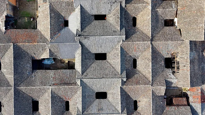 从高空俯瞰,这座大门就像一条龙的龙首,龙身是连绵的屋顶,层层叠叠的黑色瓦片就是龙鳞。这条“龙”延绵约1公里。走进大门,经过一处院落,跨进门槛,便是天井,天井连着堂屋,堂屋后又连着天井,珠串一般,共有五进。每座大门的门槛都在增高,最后一个门槛近乎半米,而堂屋位置也在逐渐垫高。这个极具仪式感和节奏感的轴线,便是“当大门”建筑群的中轴线。