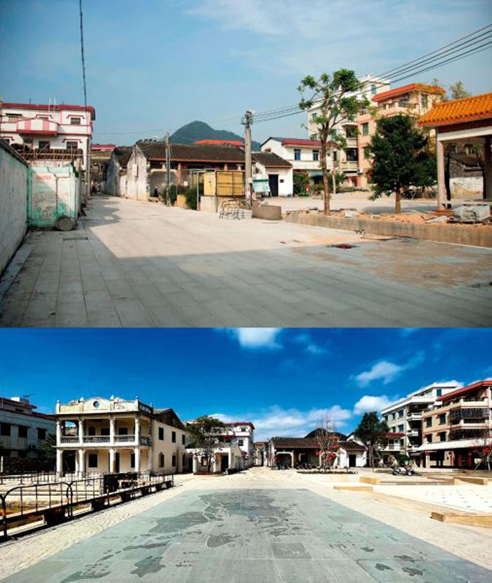 经过多轮设计,并跟村民商讨之后,建筑师们新建了一座岭南风格的建筑和一组坡屋顶廊架,用“边界限定”的方式,在四边不太规则的场地里,围合出一个400平方米的下沉广场。再在周围设计台阶、平台,形成有高差的围合庭院,让村民可以坐在台阶上休息或在廊架里乘凉。在下沉广场中部,有中间大、四周小的渐变灯光喷泉,还在街巷上复刻了岐澳古道的地形图。