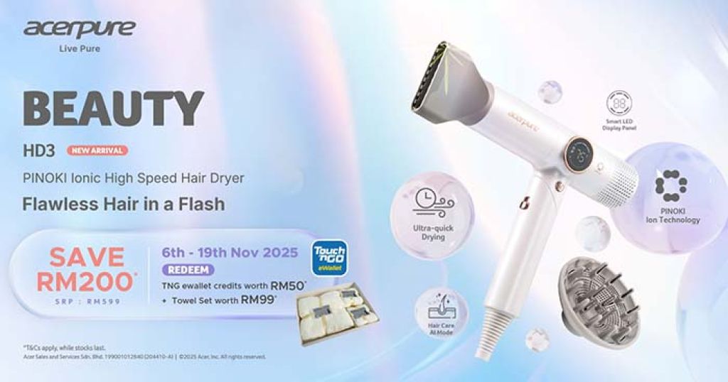 Acerpure BEAUTY HD3 即日起于 Acer eStore、Shopee 与 Lazada Acerpure 官方店同步开售,建议零售价 RM599。凡于 2025 年 11 月 19 日前购买,即可享有 RM399 首发优惠价,获赠 RM50 Touch ’n Go 电子钱包回馈及毛巾礼盒一套。