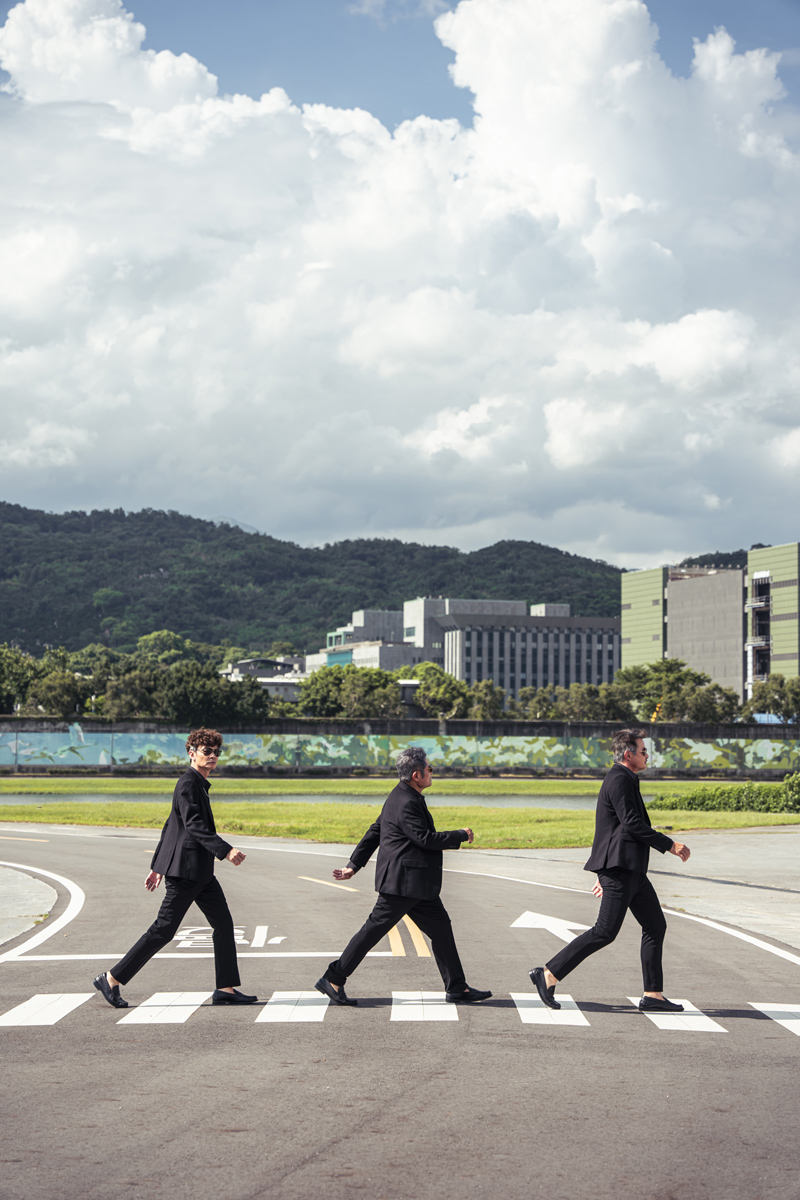 而预告海报则是三人穿上黑色西服,大刀阔斧的过马路,让人马上想起披头四的经典过斑马线的专辑封面,这也是导演致敬经典的梗图。只是经典是走得潇洒,这张则是走得充满了喜感,充份带出了整套电影的欢乐气氛。