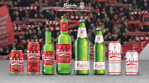 为了纪念利物浦本赛季的历史性夺冠,限量版的Carlsberg 罐和瓶一改其经典绿,都换上了利物浦足球俱乐部的标志性红色,印上队徽以及队员的个人签名。