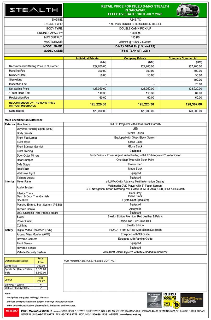 除此以外,这款五十铃限量版D-Max Stealth特别推出提供7年/无限里数原厂保修,从即日起全国所有的五十铃授权经销商皆可订购这款车,它的价格为西马半岛的RM125,799.20(上路价不包括保险),沙巴的RM128,176.20(上路价不包括保险)以及砂拉越的RM128,220.30(上路价不包括保险)。
