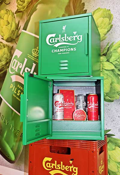 这个绿色的金属宝箱内附有两罐冠军版的 Carlsberg Danish Pilsner 和 Carlsberg Smooth Draught(顺啤)以及一个特制版,印上利物浦队徽的 Carlsberg 酒杯,附加冠军队伍签名的Carlsberg 纪念杯垫。箱内的物品座垫则代表安菲尔德的草皮,四周由球会历年球迷欢呼的图片所环绕。