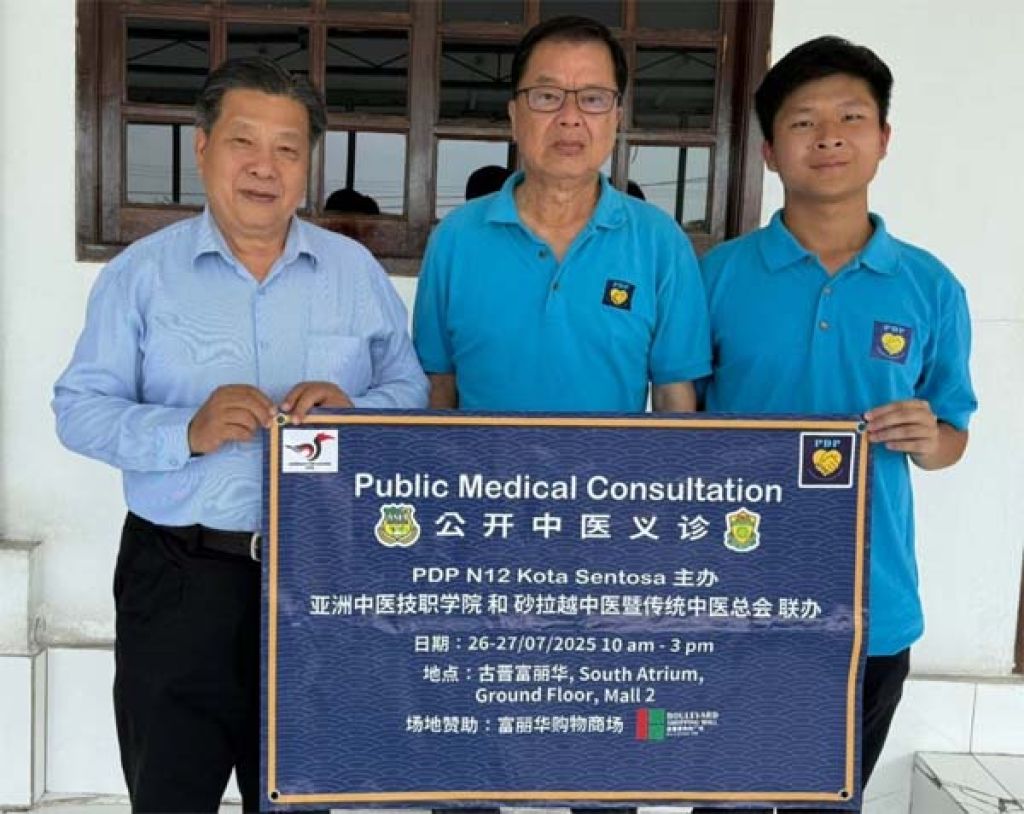 亦是砂医总会长兼亚洲中医学院院长江宗兴于今日,受民进党哥打圣淘沙支部主席黄源泰、义诊筹委主席黄国祥授旗,并将于本周六及周日(26日及27日)上午10时至下午3时,在古晋富丽华购物广场底楼做义诊。