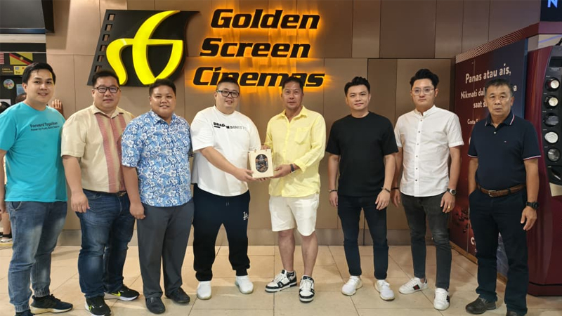 马来西亚古晋青年体育商会俱乐部筹备委员会主席赖劲成(左三)移交纪念品于活動主宾巴达旺市议会主席陈开(左四)。左起 南市市议员龚士榮及砂拉越创意协会主席龚财源;右起为马来西亚青年体育商会俱乐部筹备委员会秘书沈雄伟、马来西亚古晋青年体育商会俱乐部筹备委员财政郑植鸿及本曼查陈君义。