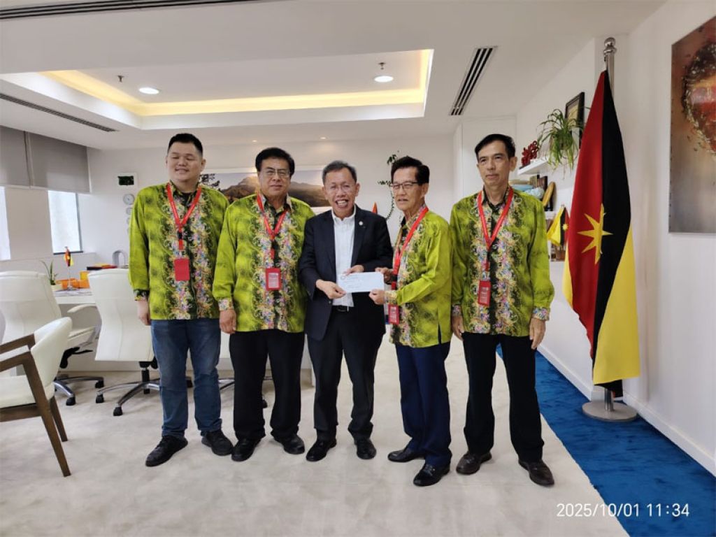 古晋启蒙文化社社长兼中秋歌唱赛晚宴筹委会主席本固鲁陈兴枝(右二)带领部分筹委会成员礼貌拜会砂拉越副总理兼公共卫生、地方政府及房屋部长拿督阿玛沈桂贤医生(中)和呈交担任晚宴主宾邀请函。右一和左二是同属筹款组、场地布置组及票务组的曾昫菖和甲必丹郑德平,以及竞赛陈永林。(左一)