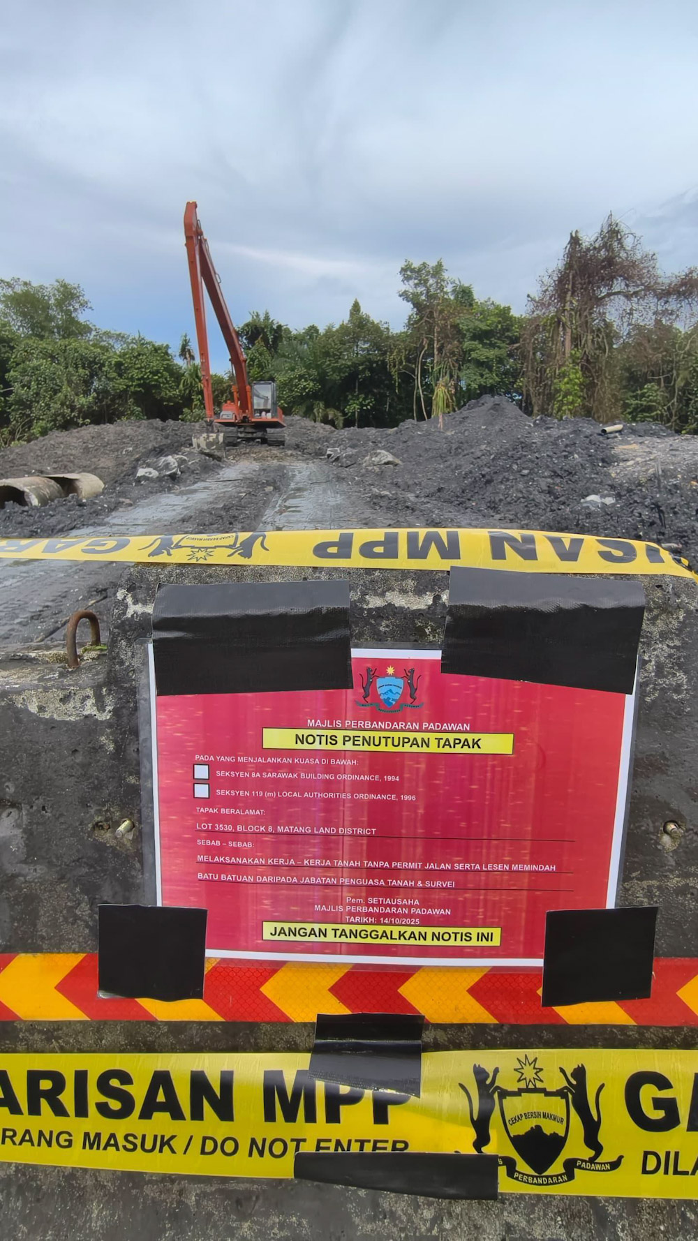 (古晋14日讯)巴达旺市议会于今日在实固邦路(Jalan Segubang)一处未经批准的工程地点设置路障,禁止进入工地,以制止未取得道路准证的非法施工活动。